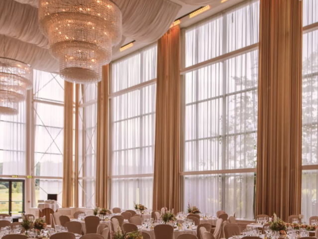 Five‑star manor and castle ruins with contemporary ballroom and civil ceremony spaces. The resort’s Ballroom, which can accommodate up to 200 guests, boasts floor-to-ceiling windows, giant chandeliers, mood lighting, and elegant drapes, all creating a magical ambience for wedding celebrations.